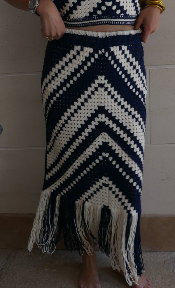Ce bas bohème à franges « Elisa » est bicolore bleu marine et blan (elle a une doublure blanche intégrée).