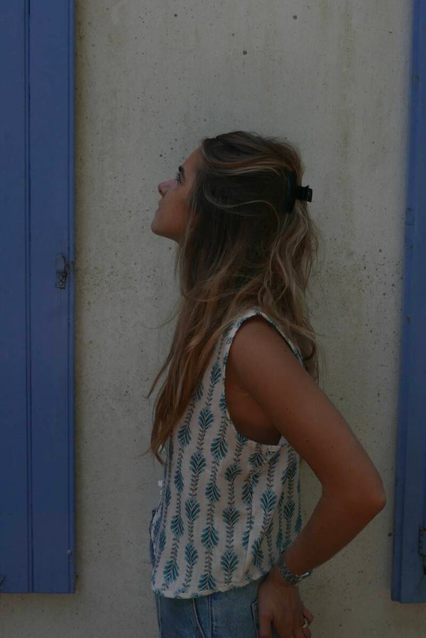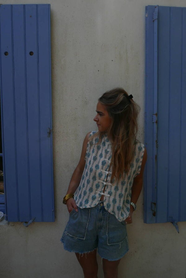 Veste légère sans manche, avec de motifs bleus et plusieurs fermetures.