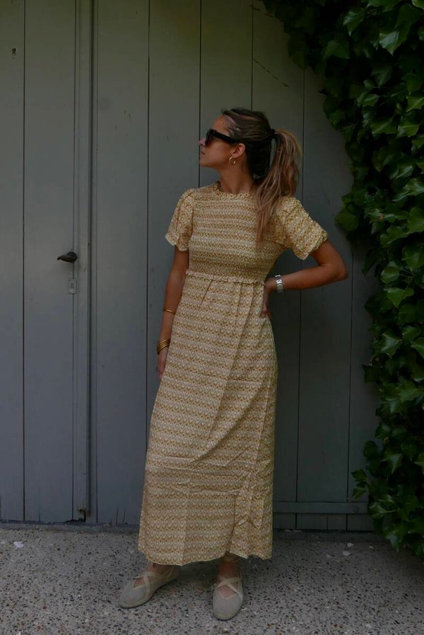 Robe Flore à motifs en smock avec un dos nu se fermant par un noeud dans le cou.